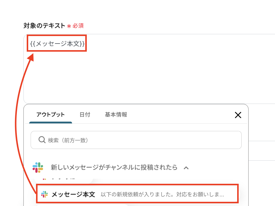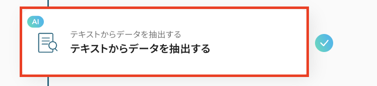 AIを活用してデータを抽出する、対象のテキストを指定します。トリガー設定で取得したアウトプットを引用して設定しましょう。