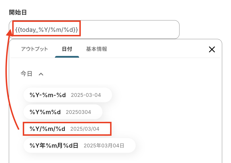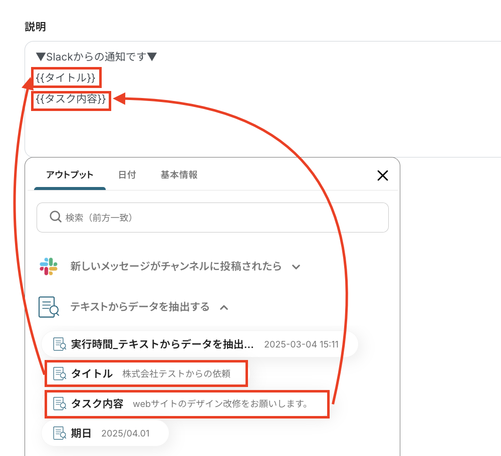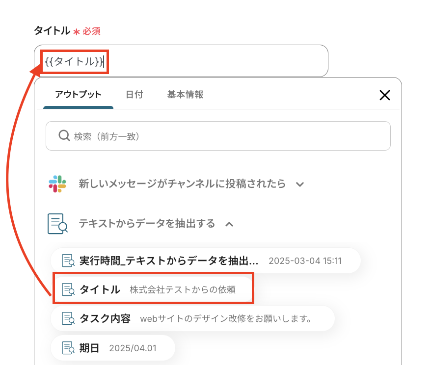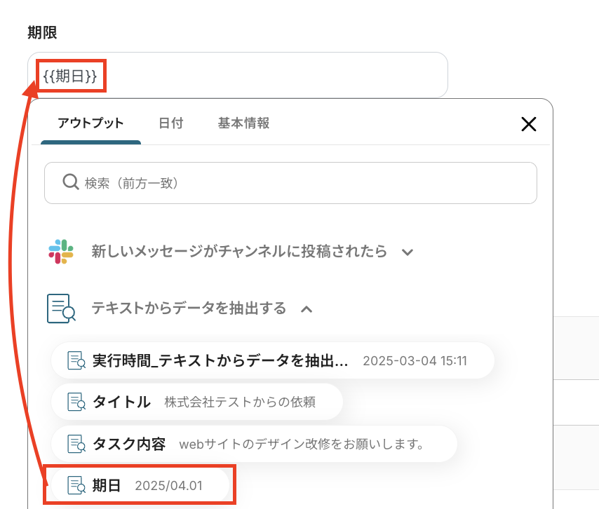 タスク期日の設定です。アウトプットを引用して設定することで、タスクごとの期日に合わせて自動登録されます。
