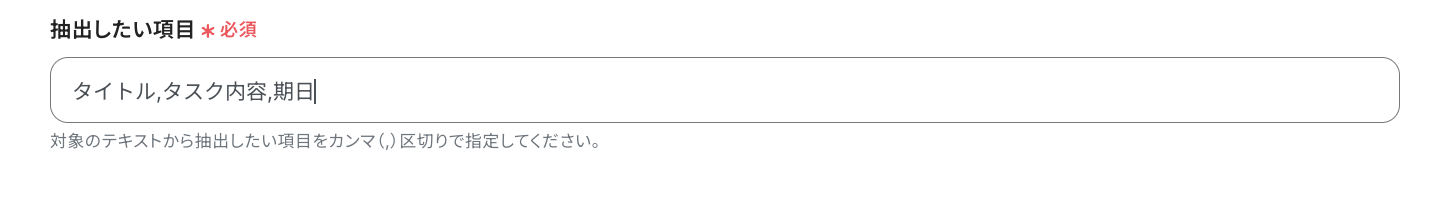 投稿されたテキストの中から、データを抽出したい項目を設定します。カンマ(,)区切りで指定してください。
