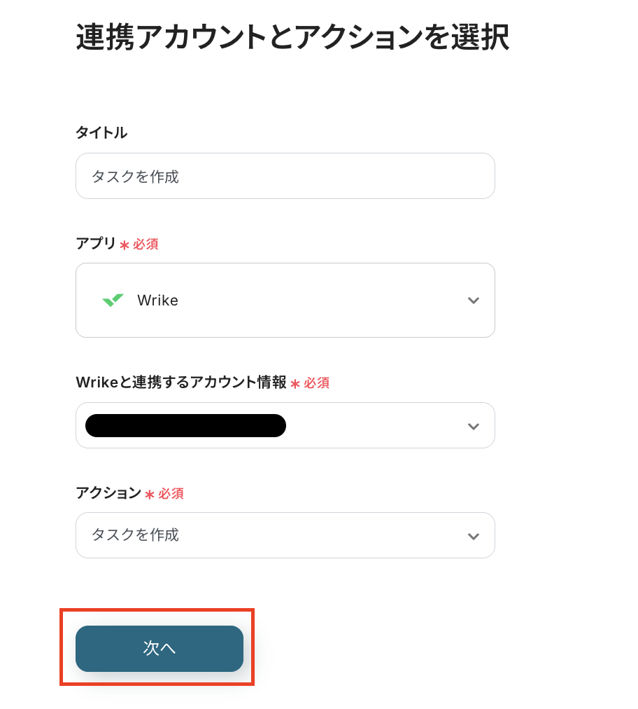 続いて、抽出したデータを基に、Wrikeにタスクを追加するアクションの設定です。