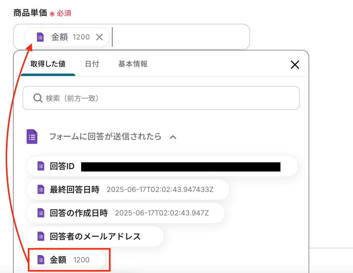 - 最後に、オペレーションとしてスマレジを選択し、「商品情報を登録」アクションを設定します。ここで、Googleフォームの回答項目(商品名、価格、JANコードなど)を、スマレジの商品情報の対応する項目に紐付けます。