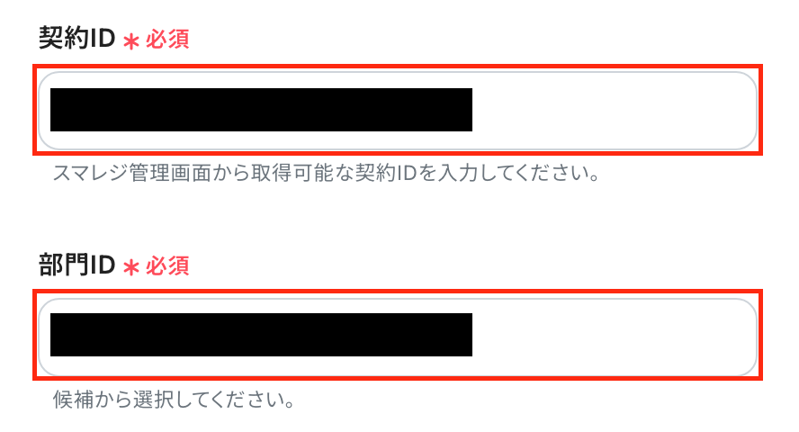 次の画面に遷移したら、必須項目を設定しましょう! まずは、「契約ID」を設定します。マイアプリ登録の際に確認したIDを設定しましょう。 「部門ID」は、入力欄をクリックして表示される「候補」から選択してください。
