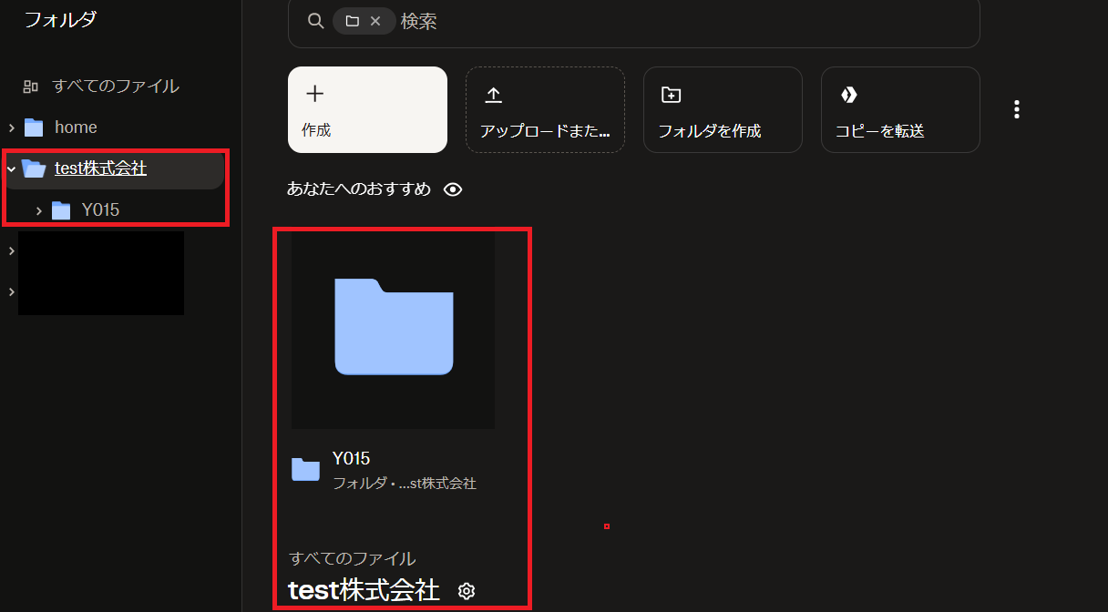 test株式会社の中に、先ほどテストしたフォルダが作成されていますね!