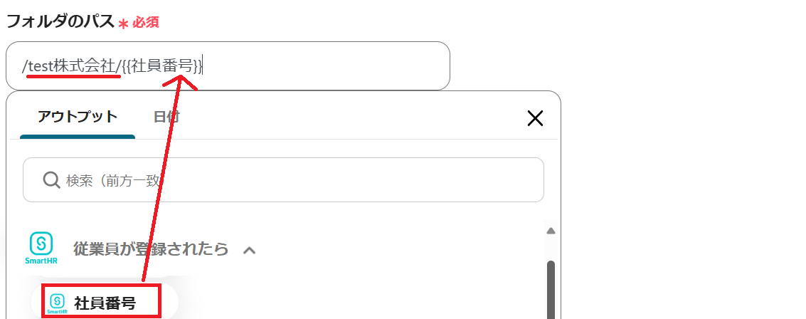個人フォルダを特定するために、今回は社員番号をアウトプットから選択します。