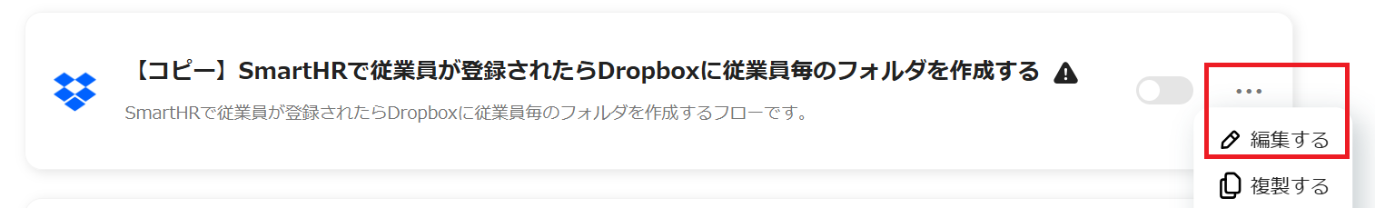 左側のマイプロジェクトをクリックすると、先ほどコピーした「SmartHRで従業員が登録されたらDropboxに従業員毎のフォルダを作成する」テンプレートが表示されます。