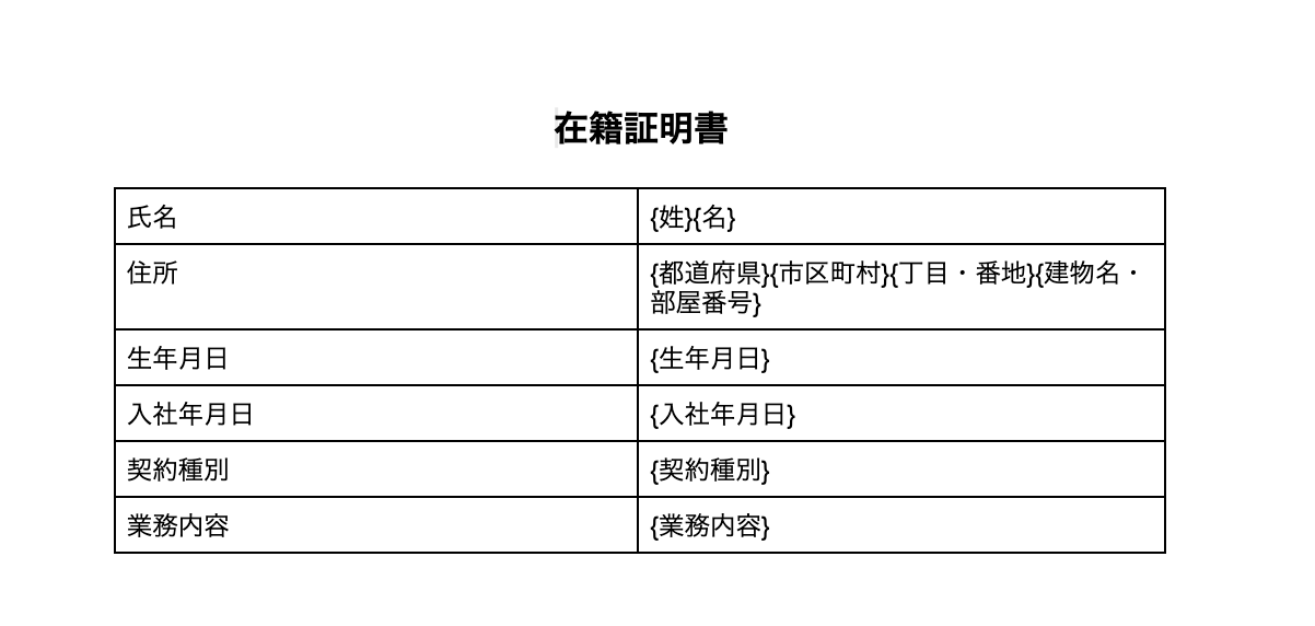後ほどこの項目を自動で取得し、値を入れることで在籍証明書の発行を自動で行うことができるので、必ず{}をつけた形で設定をしましょう。