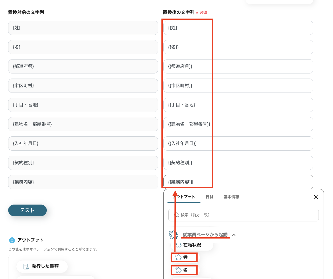 雛形書類で指定した文字列を取得し、取得した項目に入力する値を設定していきましょう。