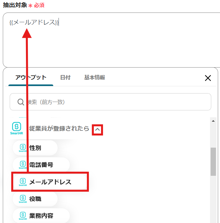 スクロールし、SmartHRのアウトプットを使用して、「抽出対象」を設定しましょう。 今回はメールアドレスを活用して、WordPress.orgのユーザーを作成するので、メールアドレスを選択します。 赤枠内の矢印をクリックすると、アウトプットを選択できます。
