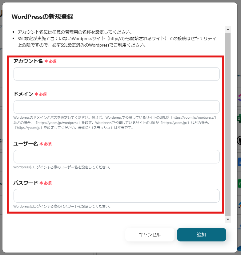 ・Wordpress、SlackそれぞれとYoomを連携してください。