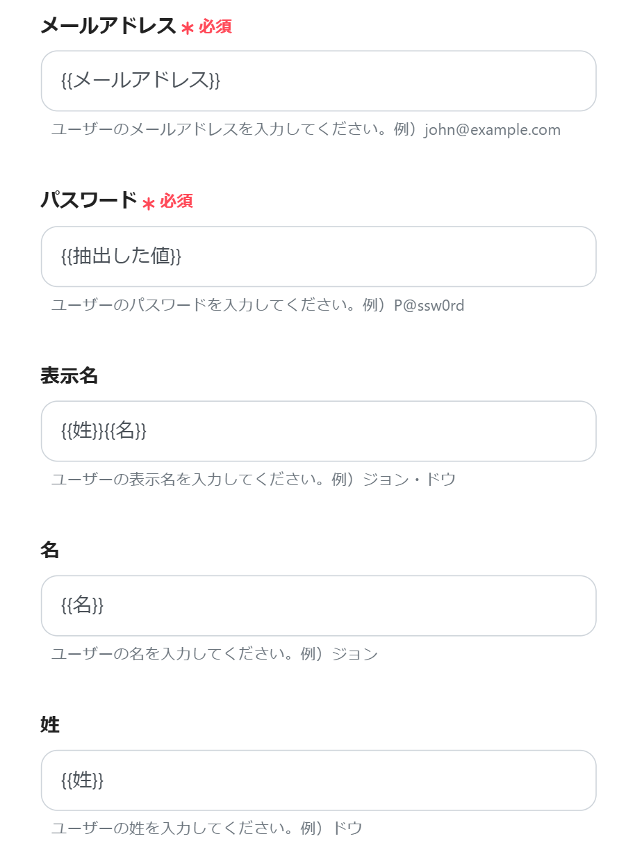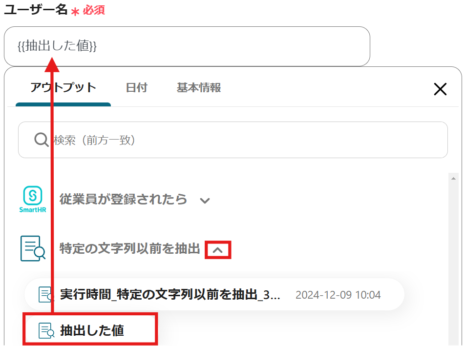 次に「ユーザー名」を設定しましょう。 先ほど設定したメールアドレスを活用して、ユーザー名を設定します。 「特定の文字列以前を抽出」のアウトプットから「抽出した値」を設定します。