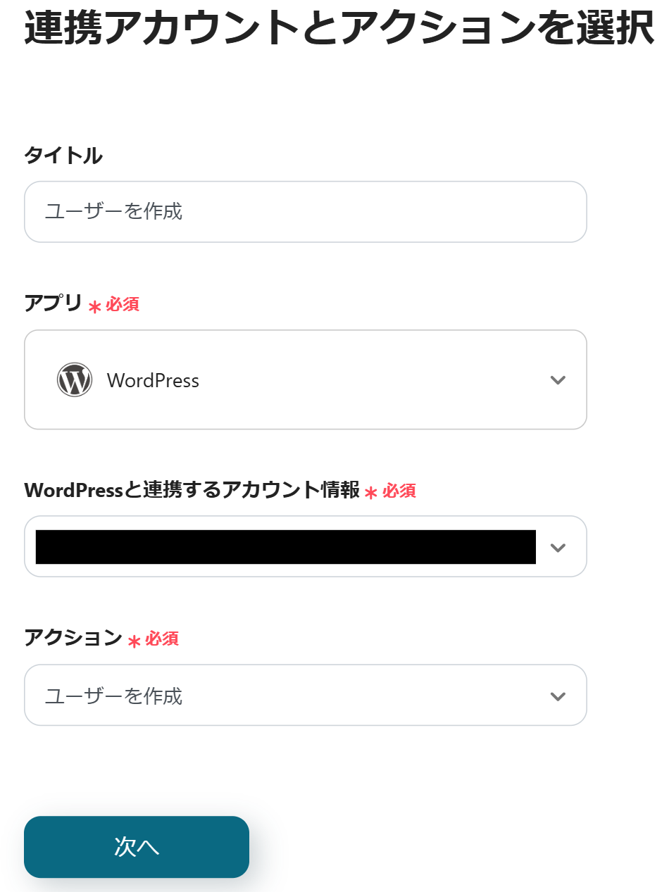 「タイトル」→お好みで変更可 「WordPress.orgと連携するアカウント情報」→アカウントが合っているか確認 「アクション」→ユーザーを作成