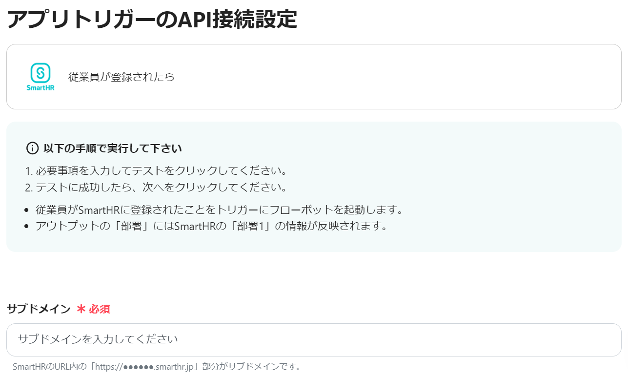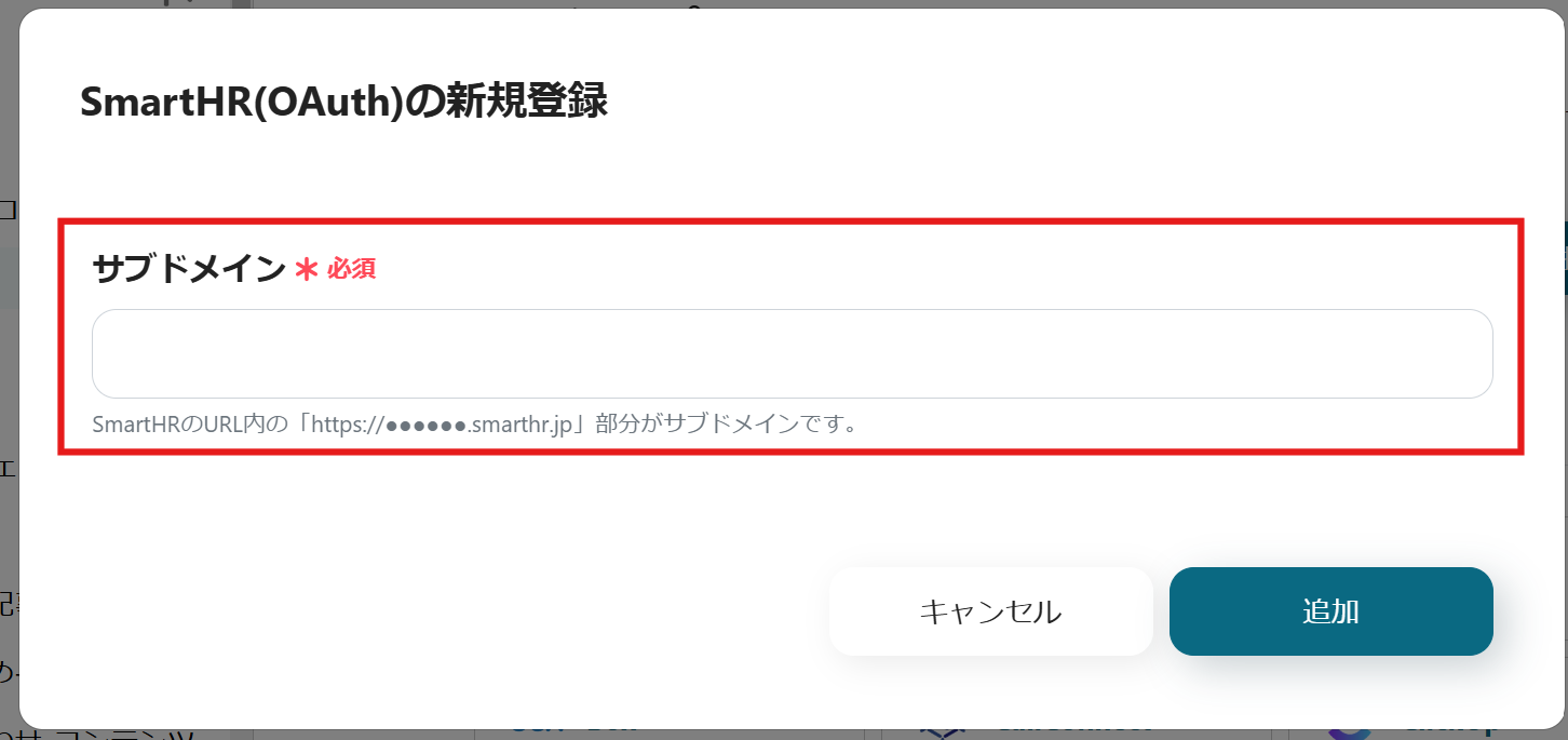 以下の画面が表示されたら、SmartHRのURLから一部を抜粋し、「サブドメイン」を設定します。