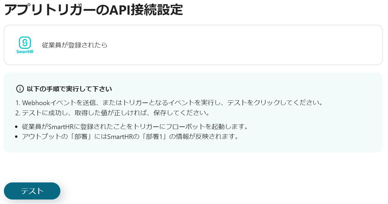 スクロールして、他の項目も設定してください。 SmartHRや特定の文字列以前を抽出のアウトプットを使用して設定しましょう。 設定が完了したら、「テスト」→「テスト成功」→「保存」をクリックします。