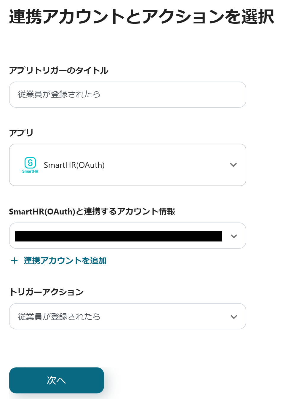 「タイトル」→お好みで変更可 「SmartHR(OAuth)と連携するアカウント情報」→アカウントが合っているか確認 「トリガーアクション」→従業員が登録されたら