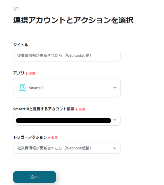 最初のページでは、SmartHRと同様でマイアプリ連携をしているアカウント情報を確認し、次へ進みます。