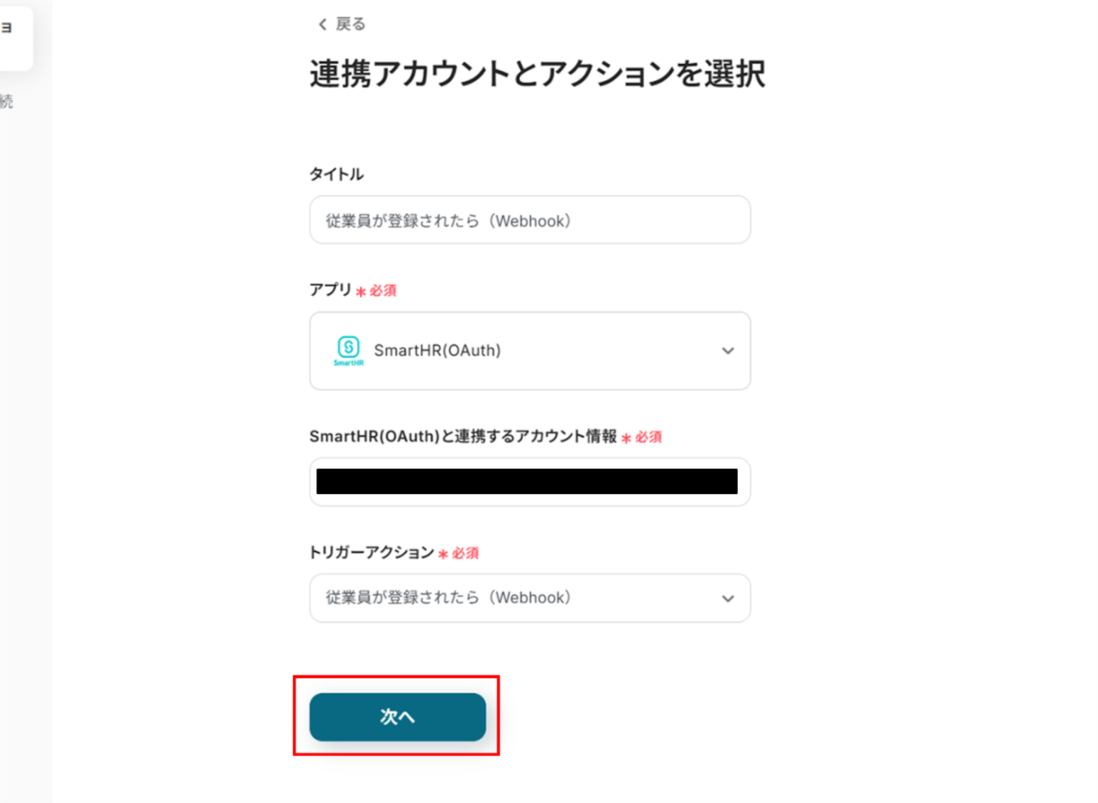 (2)SmartHRと連携するアカウント情報に誤りがないかを確認し、トリガーアクションは「従業員が登録されたら(Webhook起動)」のままで「次へ」をクリックします。