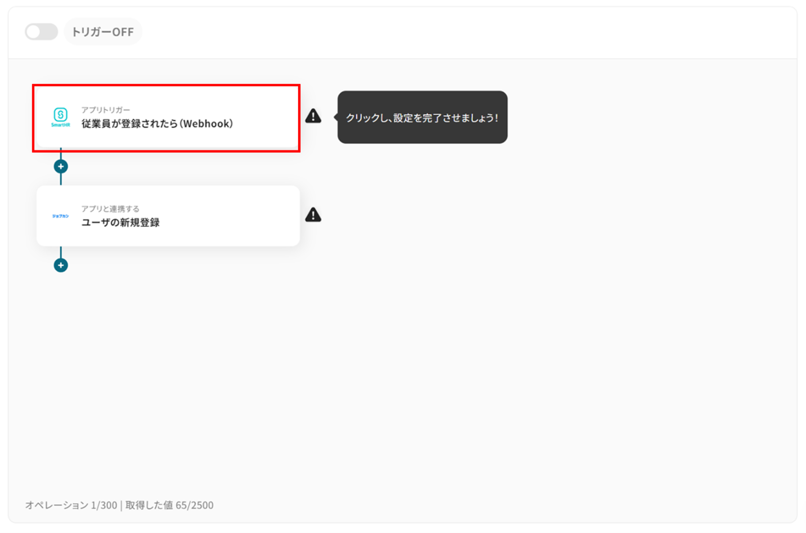 (1)アプリトリガーの「従業員が登録されたら(Webhook起動)」をクリックします。