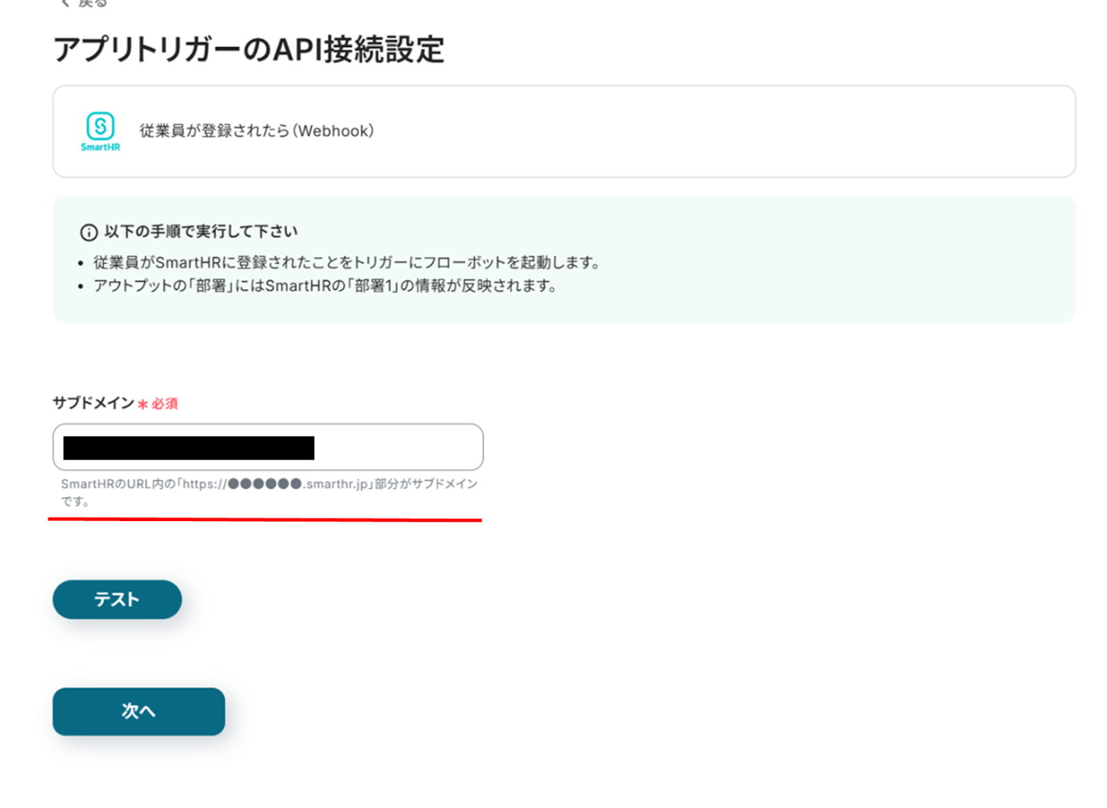 (3)「アプリトリガーのAPI接続設定」画面から、赤線を確認の上、サブドメインを入力します。