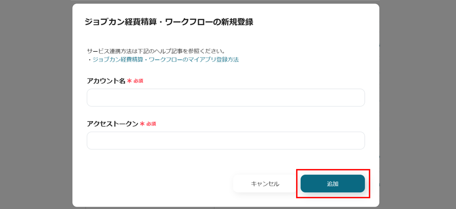 ジョブカン経費精算・ワークフローの新規登録画面が出てくるので、アカウント名、アクセストークンを入力し、「追加」をクリックします。
