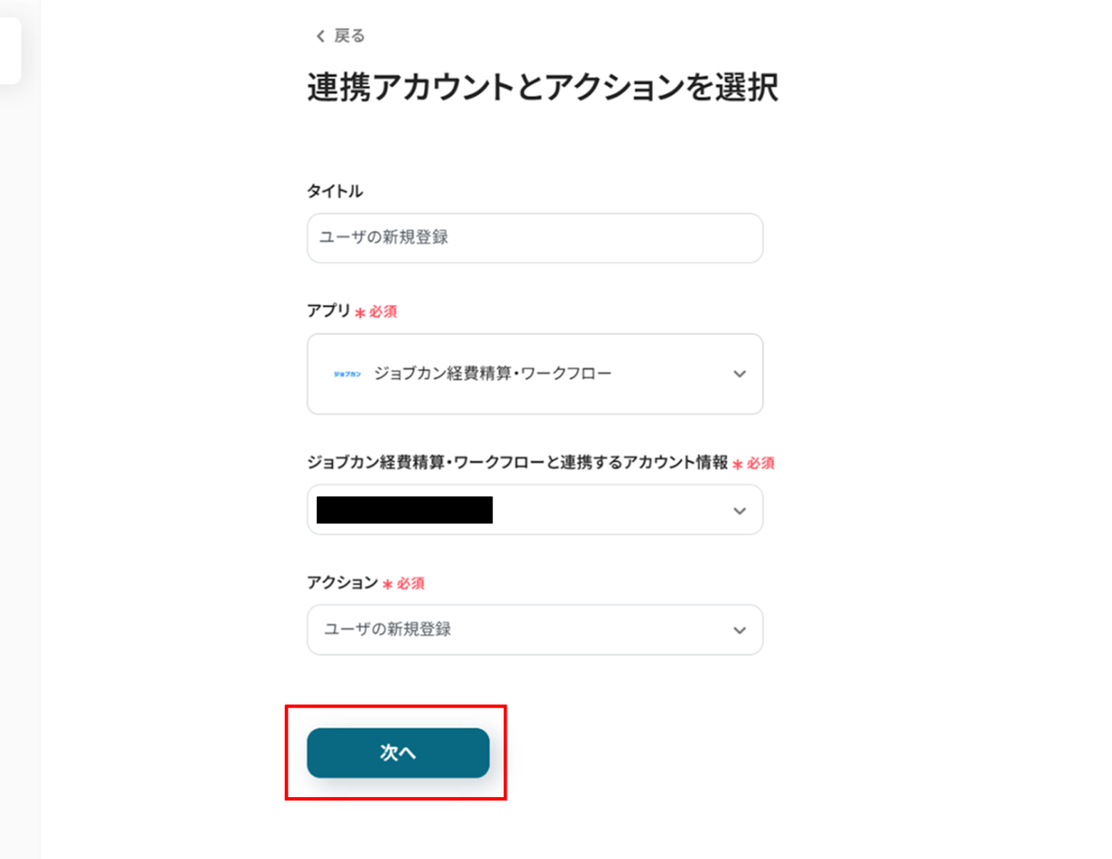 (2)ジョブカン経費精算・ワークフローと連携するアカウント情報に誤りがないかを確認し、アクションは「ユーザの新規登録」のままで「次へ」をクリックします。