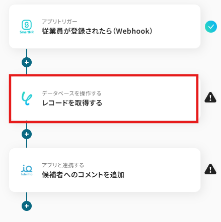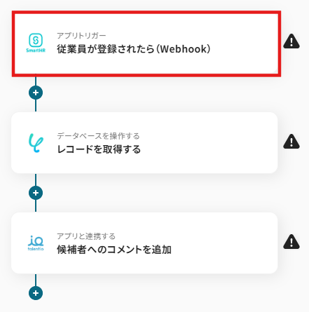 「Talentioで新たに候補者が登録されたら、SmartHRに従業員を登録する」業務ワークフローは、TalentioとSmartHRの連携を自動化し、採用から入社手続きまでをスムーズにつなげます。
