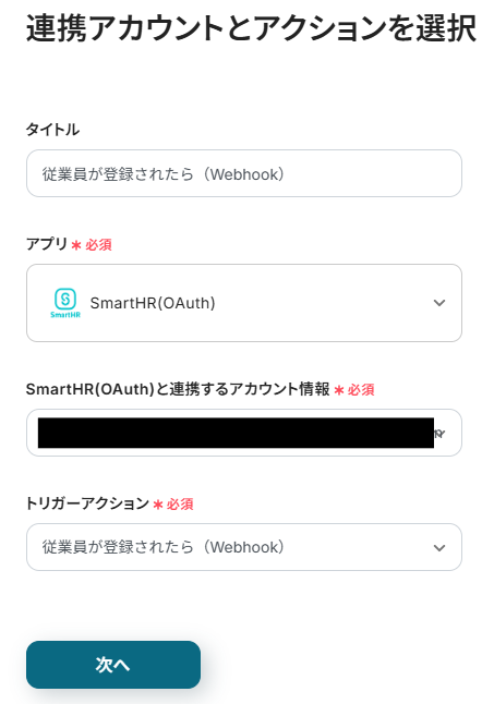 タイトルと連携するアカウント情報を任意で設定し、トリガーアクションはテンプレート通りに「従業員が登録されたら(Webhook)」のまま「次へ」をクリックして進んでください。