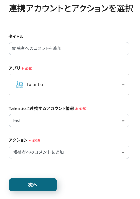 先ほどと同様にタイトルと連携するアカウント情報を任意で設定し、アクションはテンプレート通りに「候補者へのコメントを追加」のまま「次へ」をクリックして進んでください。