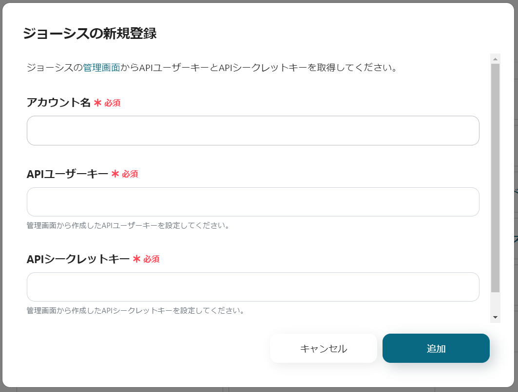 ジョーシスの管理画面からAPIユーザーキーとAPIシークレットキーを取得してください。