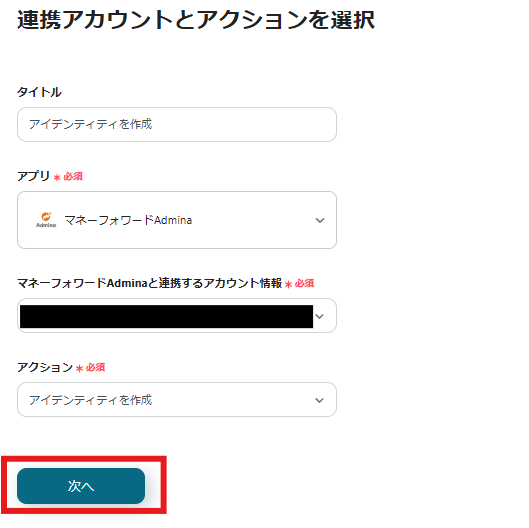 以下の画面で、今回連携するマネーフォワード Adminaのアカウントで間違いないかを確認し、間違いがなければ「次へ」をクリックします。
