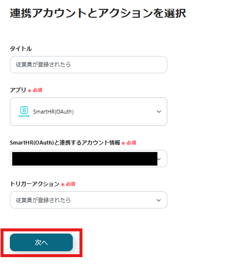 今回連携するSmartHRのアカウントで間違いないかを確認し、「次へ」をクリックしましょう。
