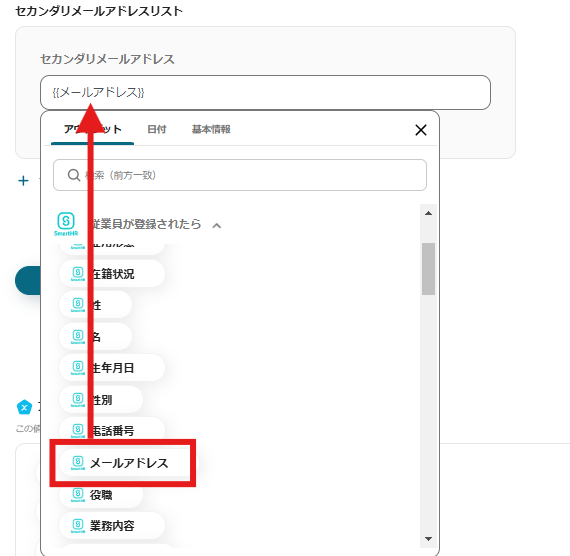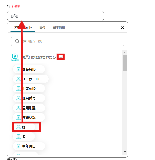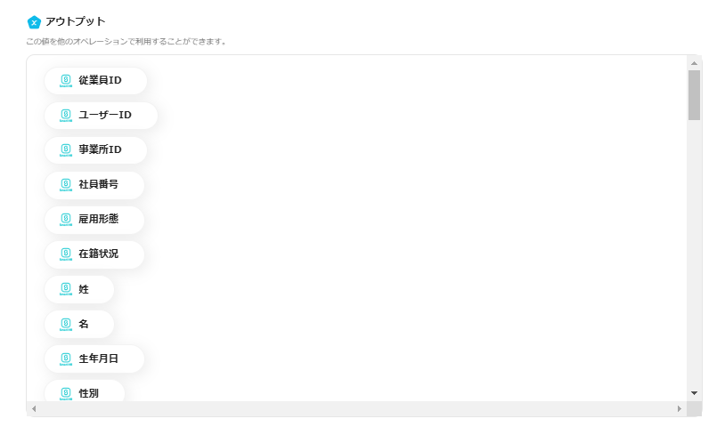 「従業員が表示されたら」のアウトプットから「姓」「名」を選択しましょう。