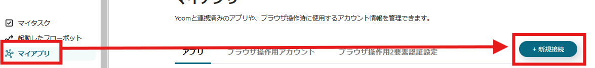 先ほど同様Yoomの画面左側にあるマイアプリメニューにアクセスし、画面右の新規接続ボタンをクリックします。