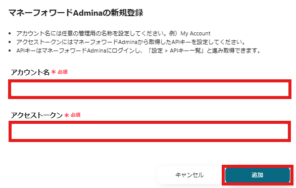・アクセストークンにはマネーフォワードAdminaから取得したAPIキーを設定してください。