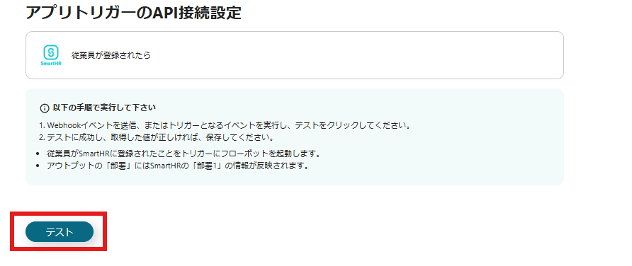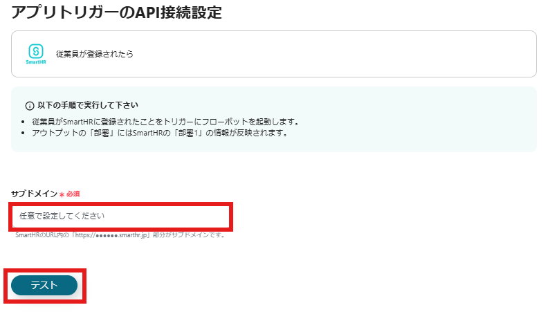 ※SmartHRのURL内の「https://●●●●●●.smarthr.jp」部分がサブドメインです。入力ができたらテストをクリックし、テスト成功を確認後「次へ」をクリックしましょう。