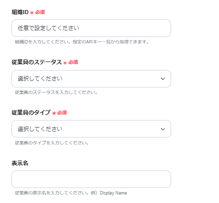 ・「従業員のステータス」、「従業員のタイプ」→任意で設定