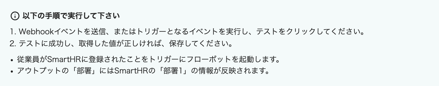 次に、「Webhookイベントを送信する」か、「トリガーとなるイベントを実行(従業員追加)する」か、どちらかを行い、アウトプットを取得します。