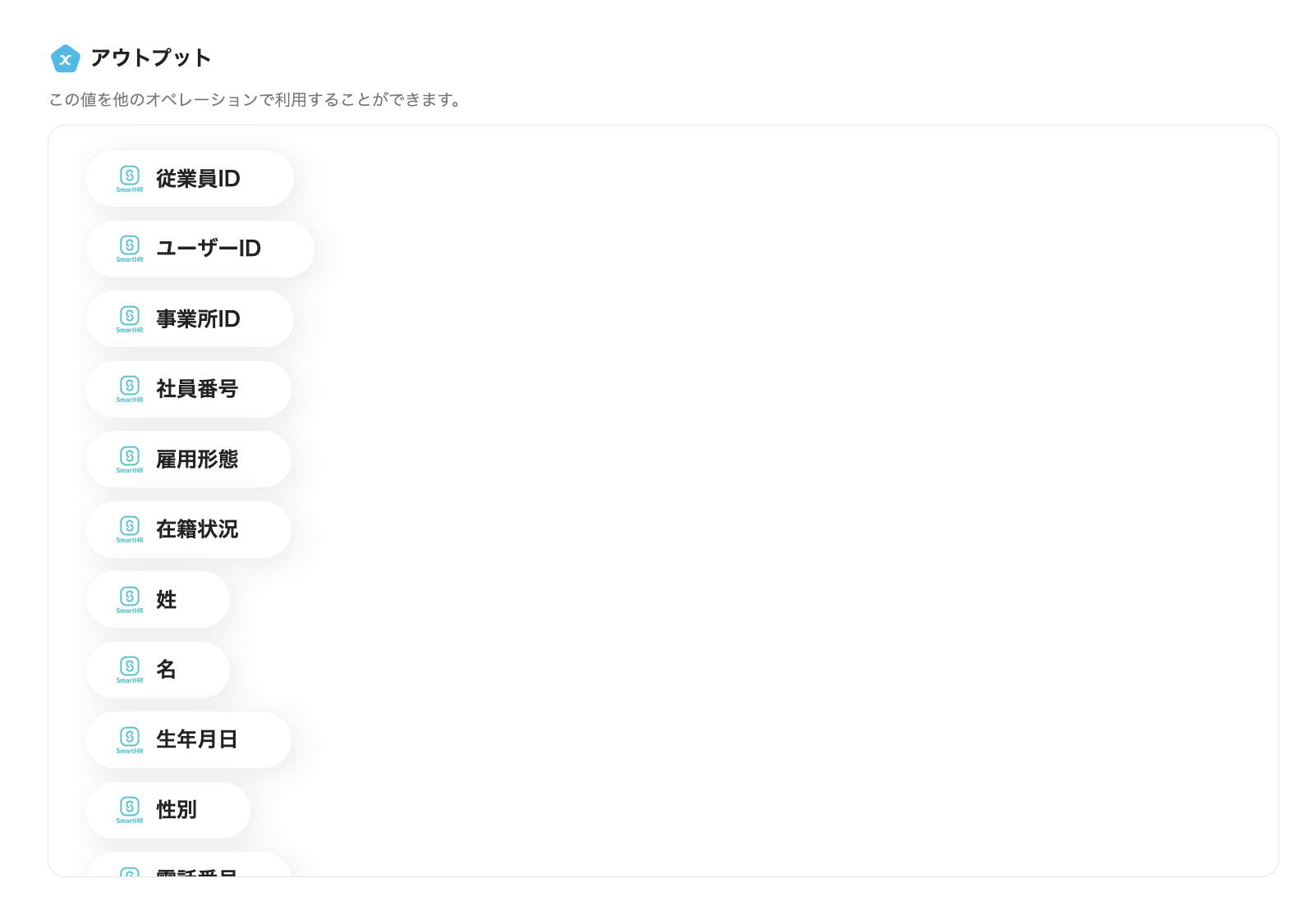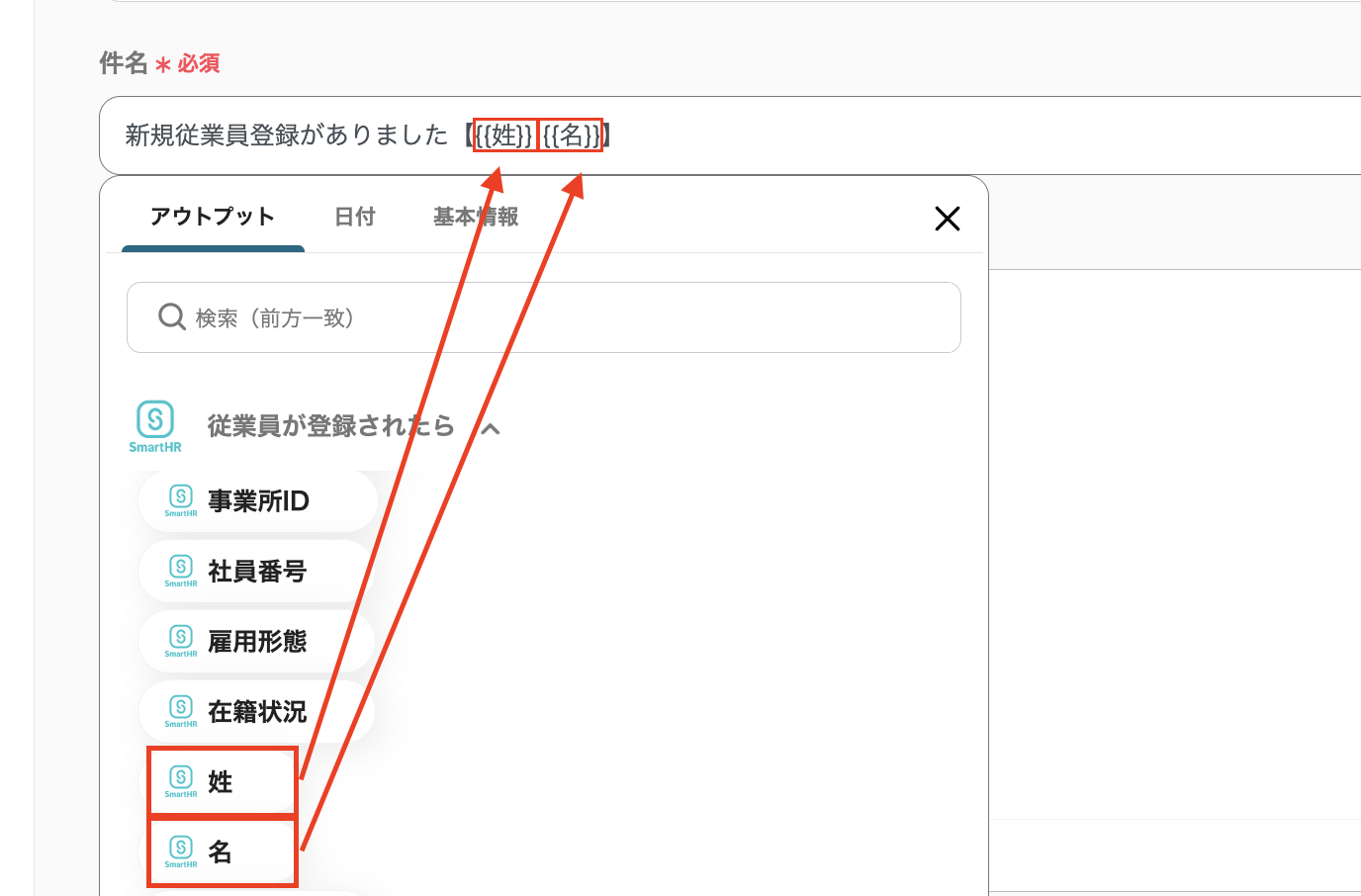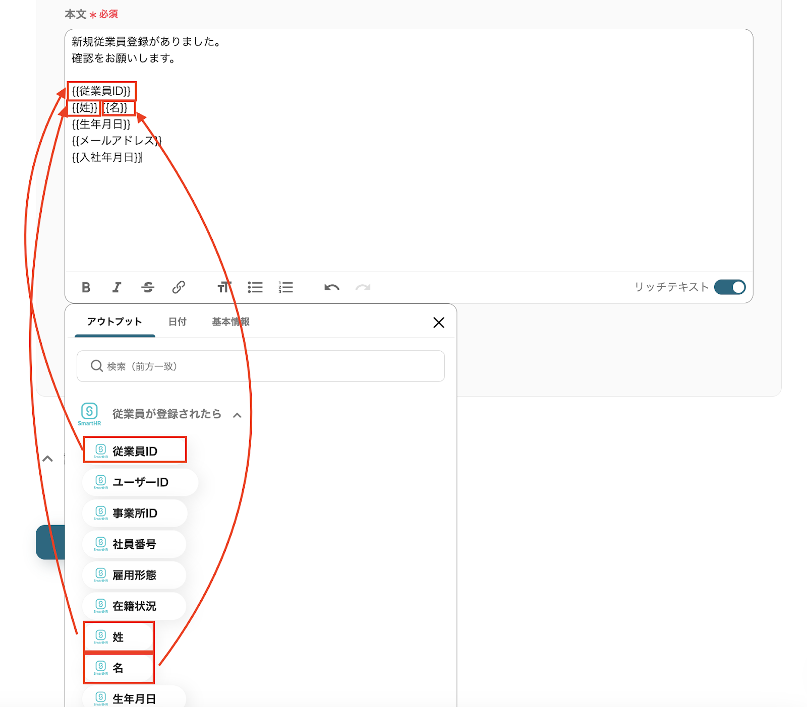 どの従業員情報でも共有で運用できるテキストは定型文として手入力し、従業員ごとに異なる情報については、SmartHRから取得したアウトプットを引用して設定しましょう。