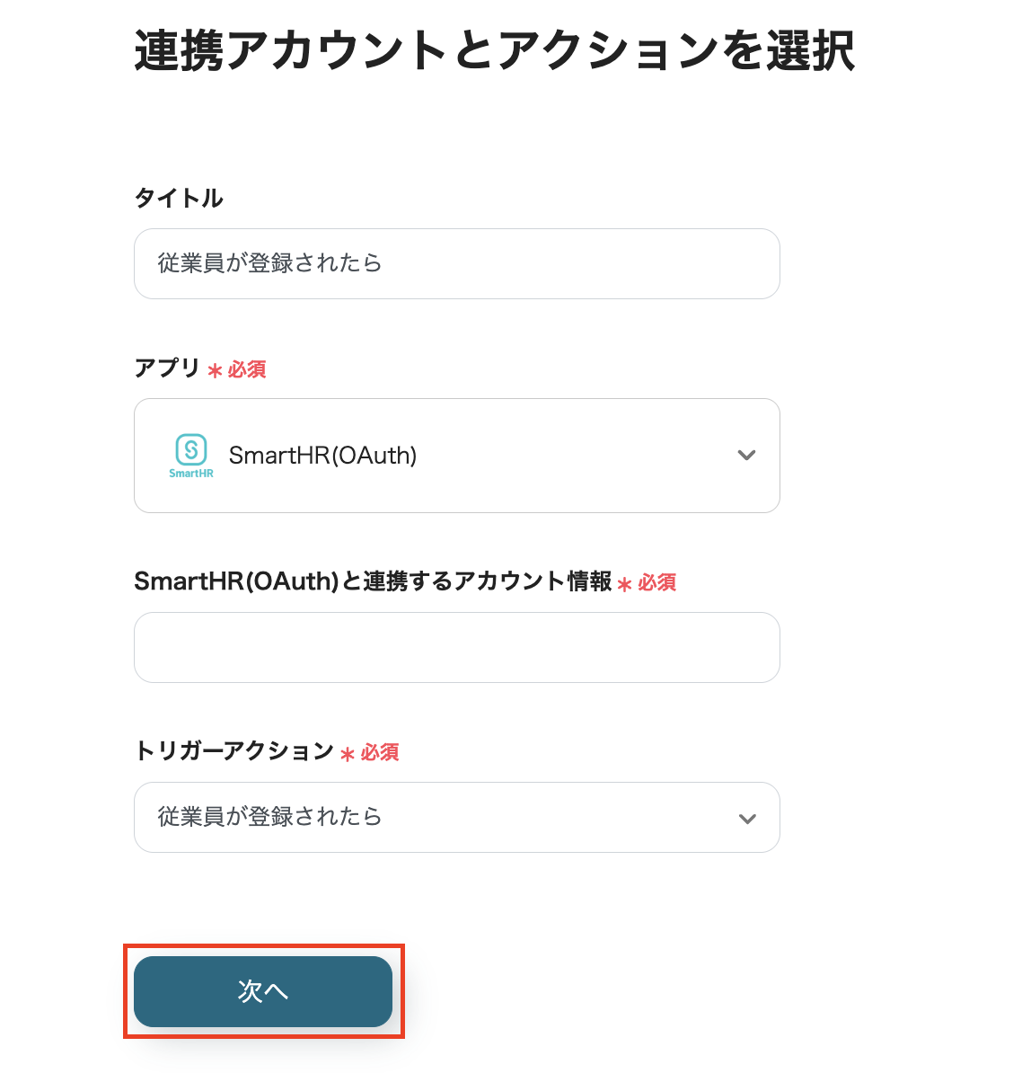 ・トリガーアクション:「従業員が登録されたら」が選択されていることを確認します
