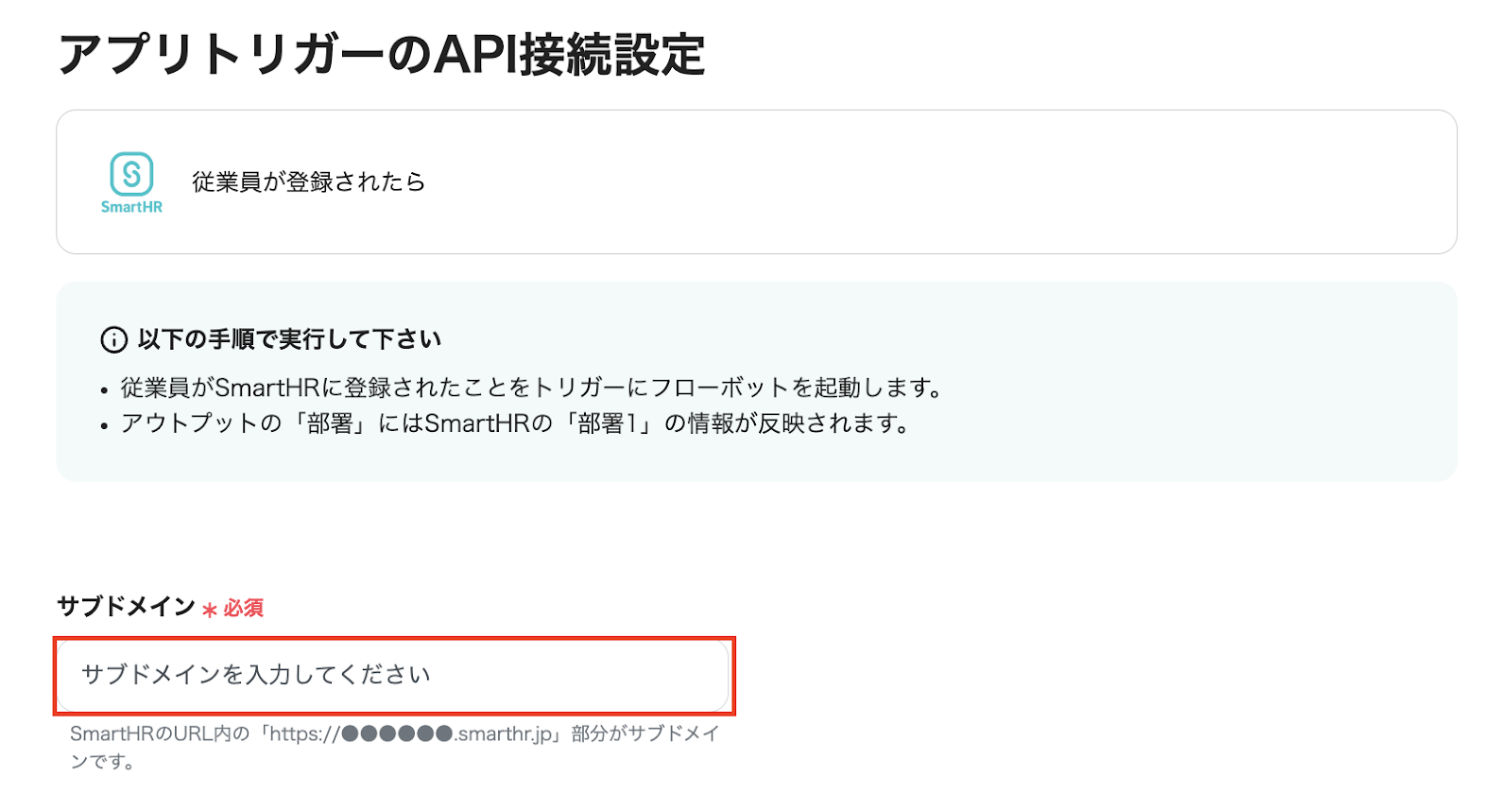 SmartHRに従業員が登録されたことをトリガーにフローボットが起動するように、SmartHR管理画面から該当ページのサブドメインを確認し、下図の赤枠に入力しましょう。