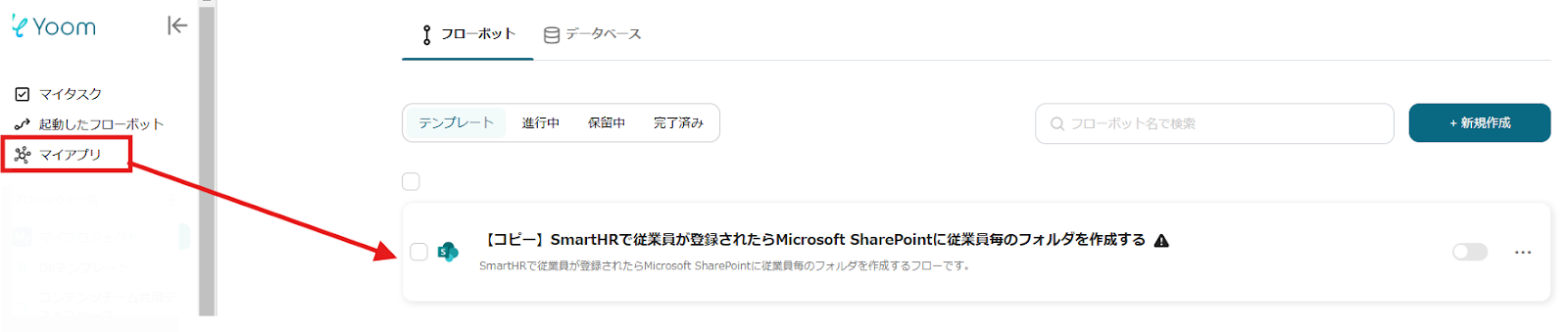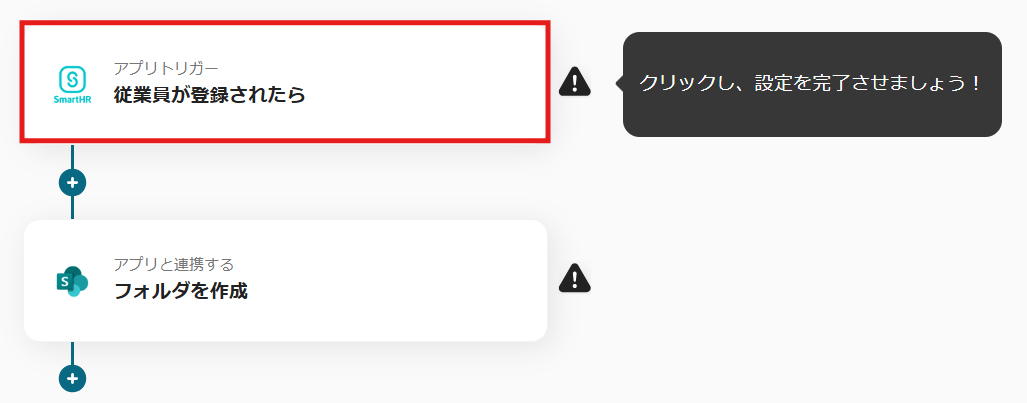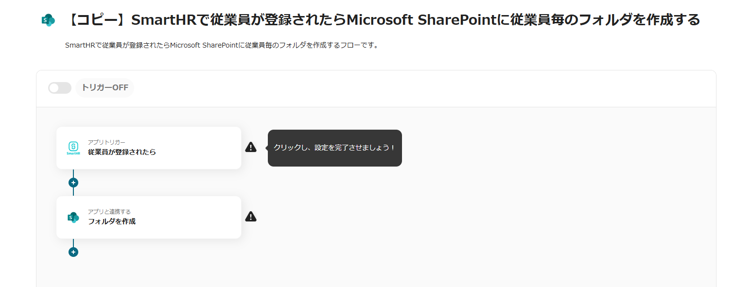 ここからは、Yoomのテンプレート【SmartHRで従業員が登録されたらMicrosoft SharePointに従業員毎のフォルダを作成する】という連携フローを使って設定をしていきます。