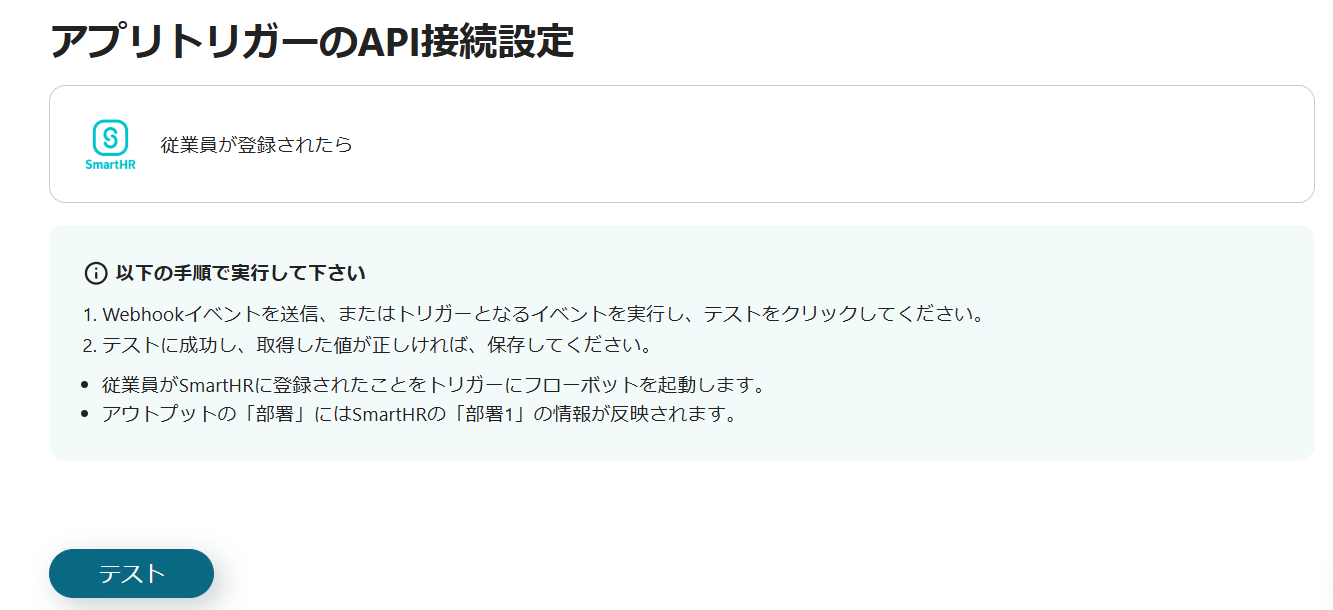 3) Webhookイベントを送信するかトリガーとなるイベントを実行し、「テスト」をクリックします。