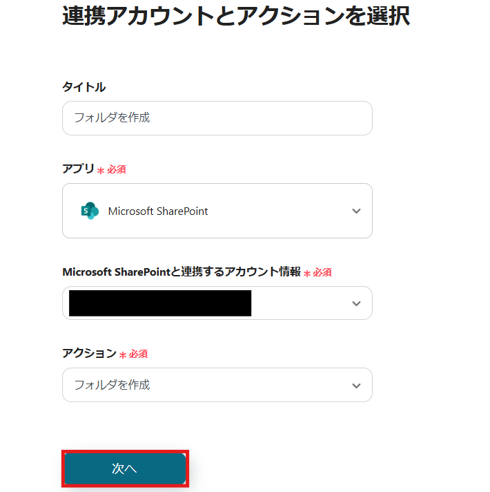 2) アクションは「フォルダを作成」を選択してデータベースIDを入力し、「次へ」をクリックします。