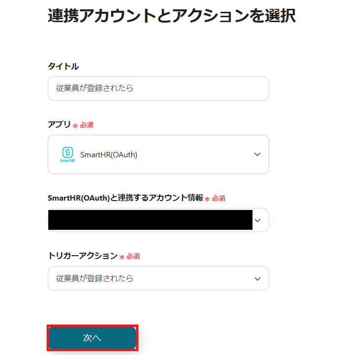 1) アクションは「従業員が登録されたら」を選択して、「次へ」をクリックします。