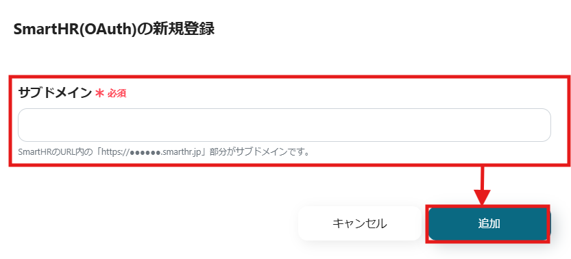 SmartHR(OAuth)を選択できたら、事前に保存しておいたサブドメインを入力し、「追加」をクリックします。