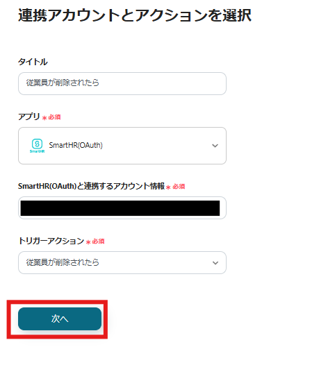 「連携アカウントをアクションを選択」の画面が表示されるので、「次へ」をクリックしましょう。