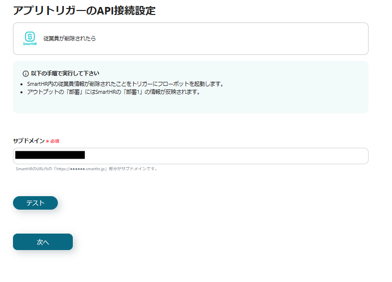SmartHRで取得したサブドメインを入力する必要があるため、SmartHRへアクセスしサブドメインを取得し、入力しましょう。