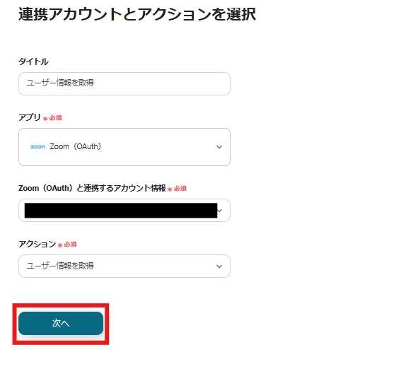 「連携アカウントとアクションを選択」の画面がひょじされるので、「次へ」をクリックしましょう。