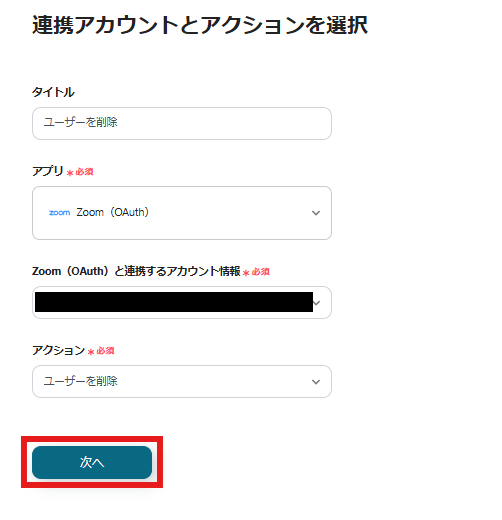 「連携アカウントとアクションを選択」の画面が表示されるので、「次へ」をクリックしましょう。