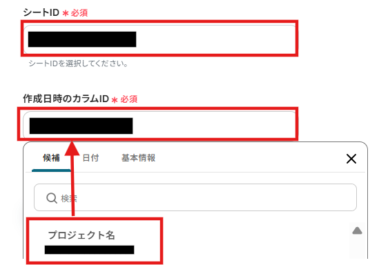 4.「シートID」と「作成日時のカラムID」は入力欄をクリックし、任意の候補から選択しましょう。