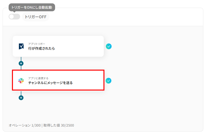 続いて、Smartsheetで抽出したデータを、Slackのチャンネルにメッセージを送信する設定をしましょう。